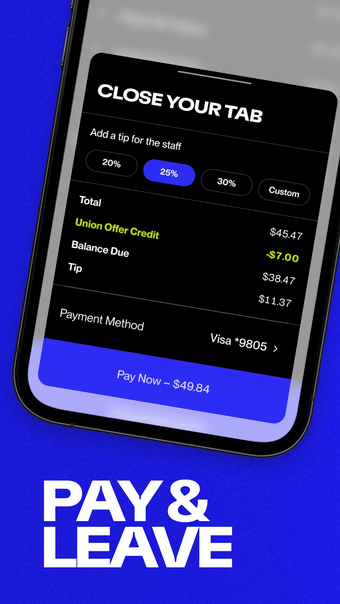 Một trong những tính năng quan trọng nhất của Union là đặt hàng di động. Bạn có thể sử dụng tính năng này để nhận hàng tại bàn hoặc lấy hàng tại quầy bar, loại bỏ việc phải chờ đợi. Hơn nữa, bạn có thể xem tab của mình trực tiếp trong ứng dụng và dễ dàng đặt lại những món ưa thích. Union cũng cung cấp các ưu đãi độc quyền mà bạn có thể đổi được qua ứng dụng.